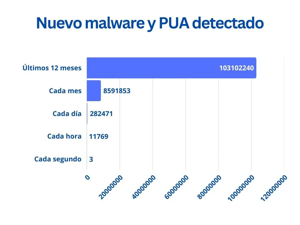 Según AV-Atlas, cada día se detectan un mínimo de 282.471 programas maliciosos nuevos, ya sea en la forma de virus, malware, troyanos o PUAs (Aplicaciones Potencialmente no Deseadas). Esto se traduce en un total de 103,102,240 millones de amenazas digitales nuevas cada año.