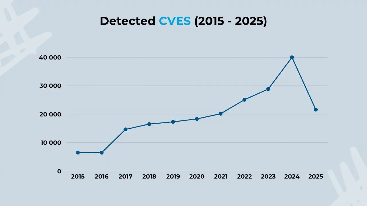 Sources like CVE.ICU have documented the number of detected vulnerabilities year after year. Below, we provide the results of the last 10 years: