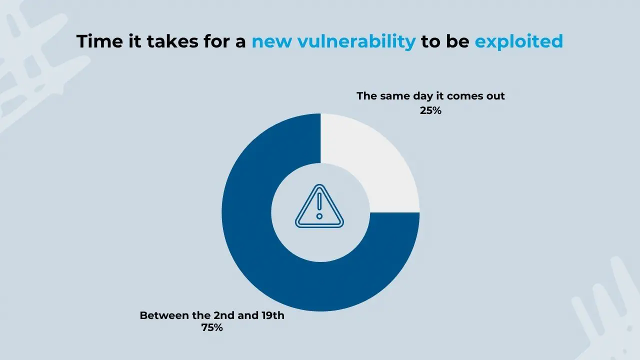 The previous points convey a clear message: it is vital for a company to respond as quickly as possible to any vulnerability. A recent study by Turfin emphasizes this fact, indicating that 1 in 4 is exploited on the same day it appears, and the remaining 75% within the first 19 days.